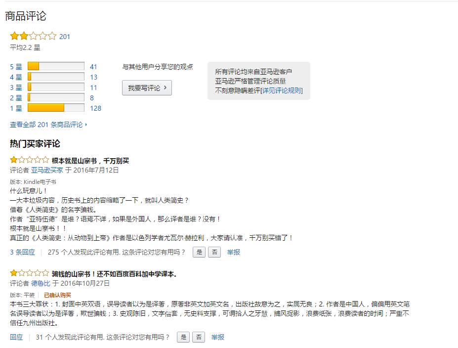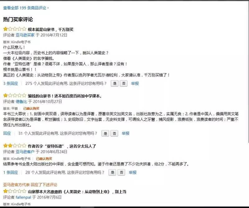 但是,這200條評(píng)論有54條好評(píng),絕大部分評(píng)價(jià)時(shí)間集中于2016年5月15日與16日兩天,且不乏以“前500名評(píng)論者”為標(biāo)簽較有影響力的評(píng)論者的身影。其中某些好評(píng)更是“驢唇不對(duì)馬嘴”,被讀者識(shí)破為是對(duì)尤瓦爾《人類簡(jiǎn)史》的評(píng)價(jià)。