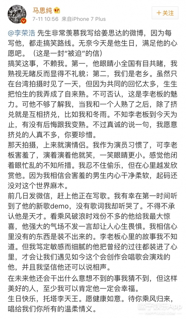 原來是因為馬思純在微博寫了一封長信祝福李榮浩的生日,她還調(diào)侃這是一封“被迫”的信。