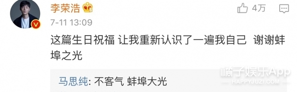 隨后李榮浩就在底下評論說馬思純的這篇生日祝福讓他重新認(rèn)識了自己,還稱她為“蚌埠之光”。而馬思純也回復(fù)他說“不客氣,蚌埠大光?!?/p>