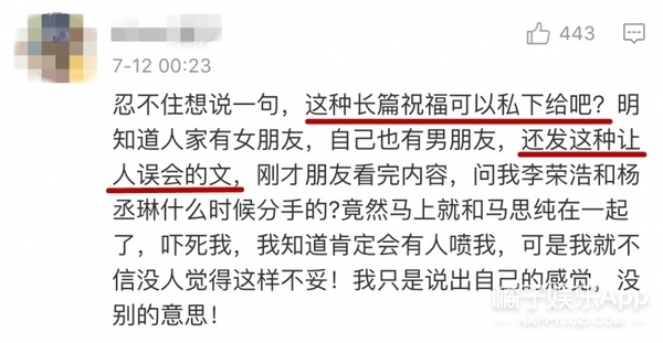 然而,評論的畫風(fēng)走向有點讓人意外。不少網(wǎng)友認(rèn)為馬思純有歐豪了,李榮浩也有楊丞琳了,這種長文祝福信不應(yīng)該公開發(fā)↓
