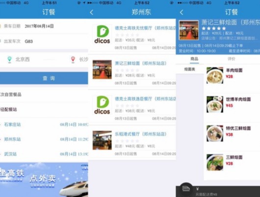 基于手機(jī)高鐵購票APP,消費(fèi)者打開之后轉(zhuǎn)到商旅服務(wù)一欄找到訂餐服務(wù),在上面輸入乘車日期和車次之后就能選擇餐點(diǎn),再填寫姓名和座位號(hào)等信息,付款成功之后就能“坐等”外賣送達(dá)手中。