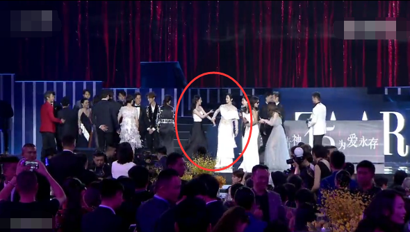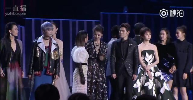 后來(lái)黃曉明隊(duì)和吳秀波隊(duì)的人一上來(lái),舞臺(tái)上就滿了,而張韶涵的位置從劉嘉玲的右邊換到了劉嘉玲左邊,變成在李冰冰和劉嘉玲中間??梢钥吹剿?dāng)時(shí)也還是挺尷尬的。然后李冰冰和張韶涵身邊的劉嘉玲握手寒暄,張韶涵尷尬的站在原地。