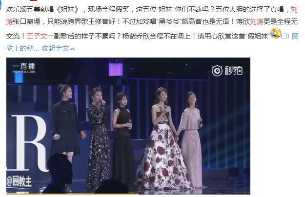歡樂(lè)頌五美直接把感情寫(xiě)在歌上,可惜,一首《姐妹》唱的比時(shí)代姐妹花還尷尬。