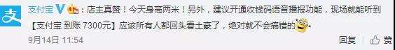 對此,支付寶官方表示,建議開通收錢碼語音播報功能,現(xiàn)場就能聽到“支付寶到賬7300元”,應該所有人都回頭看土豪了,絕對就不會搞錯的。