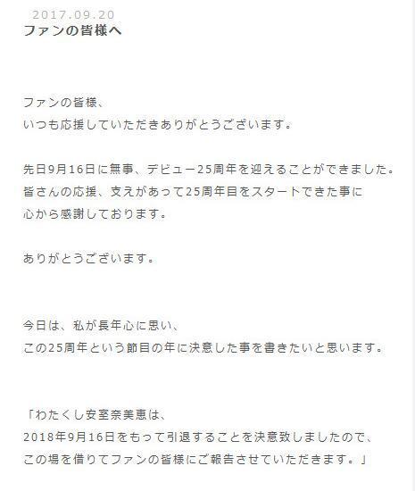 我“安室奈美惠”想借此機(jī)會告訴我所有的粉絲,我決定于明年2018年9月16日正式隱退。