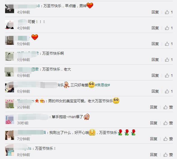 網(wǎng)友也紛紛評論說:“男的帥女的美寶寶可愛。老大萬圣節(jié)快樂”、“老大千鈺姐萬圣節(jié)快樂?。?!我在寫作業(yè)里贏來了萬圣節(jié)orz……老大晚上早點(diǎn)睡呀,雖然可能會(huì)有很多小孩子來敲門說“不給糖就搗蛋”吧,hhhhhhh”