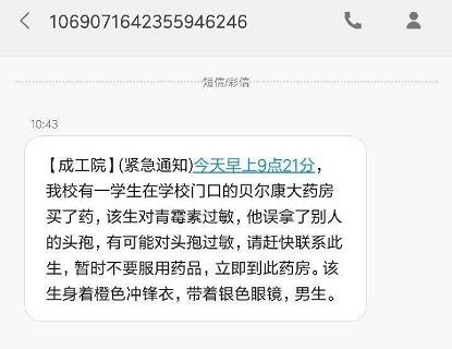 15日上午10時(shí)03分,成都工業(yè)學(xué)院接到了校門(mén)口一藥房的求助:一名戴銀色眼鏡,身著橙色沖鋒衣的學(xué)生在結(jié)賬時(shí)誤拿了別人頭孢藥,因其告訴工作人員對(duì)青霉素過(guò)敏,如服用將可能產(chǎn)生嚴(yán)重后果。