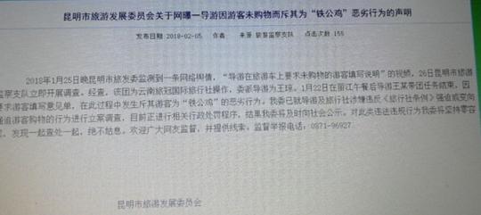 昆明市旅發(fā)委稱,2018年1月25日晚昆明市旅發(fā)委監(jiān)測到一條網(wǎng)絡(luò)輿情,“導(dǎo)游在旅游車上要求未購物的游客填寫說明”的視頻,26日昆明市旅游監(jiān)察支隊(duì)立即開展調(diào)查。經(jīng)查,該團(tuán)為云南旅冠國際旅行社操作,委派導(dǎo)游為王瓊。1月22日在麗江午餐后導(dǎo)游王某帶團(tuán)任務(wù)結(jié)束,因要求游客填寫意見單,在此過程中發(fā)生斥其游客為“鐵公雞”的惡劣行為。昆明市旅發(fā)委已就導(dǎo)游及旅行社涉嫌違反《旅行社條例》強(qiáng)迫或變向強(qiáng)迫游客購物的行為進(jìn)行立案調(diào)查,目前正進(jìn)行相關(guān)行政處罰程序,結(jié)果將及時(shí)向社會(huì)公示。