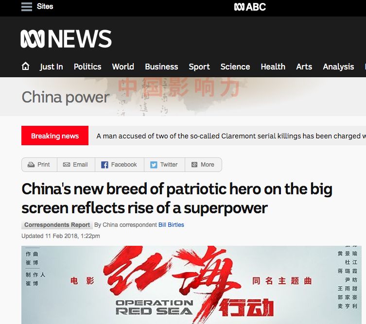 澳大利亞廣播公司新聞網(wǎng)分析稱,中國大銀幕上的新型愛國英雄反映了一個(gè)超級大國的崛起。作為中國強(qiáng)大外交自信在電影領(lǐng)域的展現(xiàn),銀幕英雄將會(huì)越來越多的揮舞著中國旗幟。