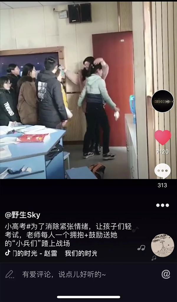 “這么做目的是給孩子們減壓,給他們打氣”,胡梅說,她這么做已有四年,每逢諸如“小高考”和高考這樣的重大考試之前,她都會給學(xué)生們挨個擁抱鼓勵。