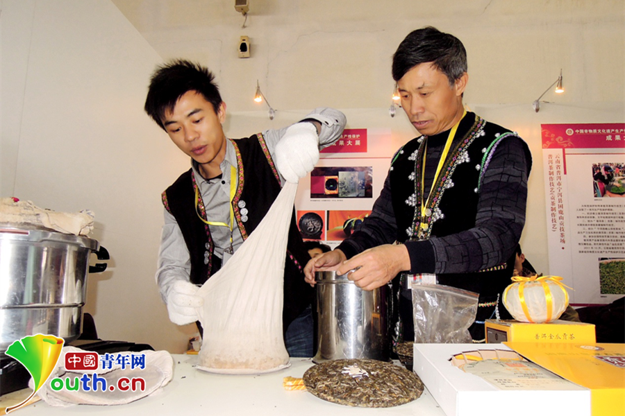 李興昌(右)與李明澤(左)在制作普洱茶。