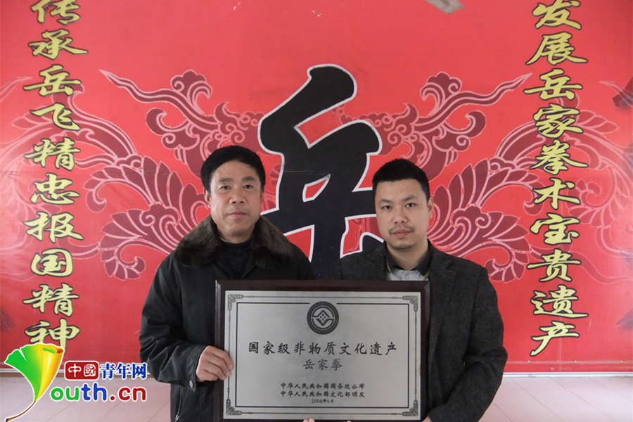 2008年,岳家拳正式被國(guó)務(wù)院批準(zhǔn)為國(guó)家級(jí)非物質(zhì)文化遺產(chǎn)。張業(yè)金(左)與張奇鋼(右)從北京捧回岳家拳非遺匾。