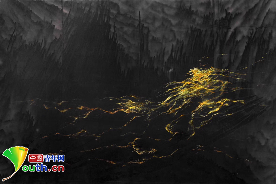 金線用蘇繡典型的平針繡法繡在真絲底料上,明暗金黃色從近處向遠(yuǎn)處延伸,燈光照射下,一如夜空中的萬(wàn)家燈火。若有燈光照射,參觀者會(huì)發(fā)現(xiàn)整個(gè)底料上還暗藏一幅潑墨山水畫(huà)。