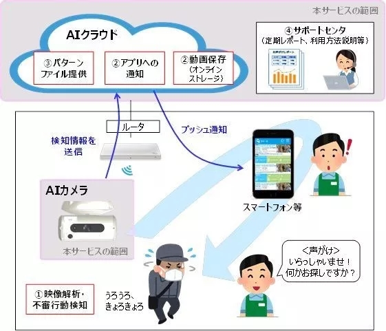 AI Guardman的示意圖。利用深度學習識別可疑行為,并通過app向店主發(fā)出警報,接著店員便可以前往提供禮貌性的幫助。