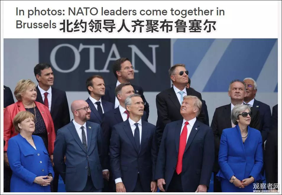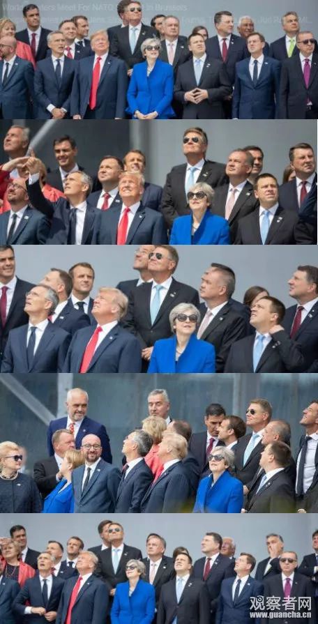 而這張神奇的照片里,幾乎所有人,包括法國(guó)總統(tǒng)馬克龍、德國(guó)總理默克爾、英國(guó)首相特蕾莎·梅這些“老朋友”,都看向自己的左邊,而特朗普則執(zhí)著地望向右邊的天空。