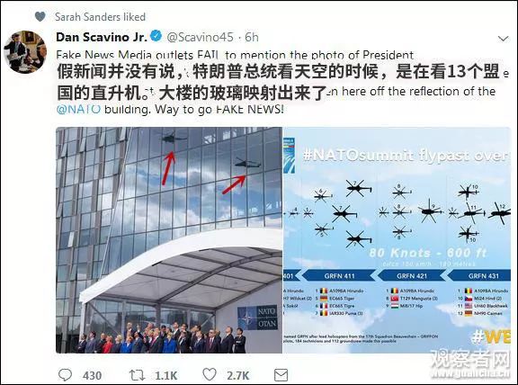 但是,白宮社群媒體主任史卡比諾 (Dan Scavino Jr。)卻站出來(lái)指責(zé)“假新聞”。他表示,當(dāng)時(shí)各國(guó)領(lǐng)導(dǎo)人正在抬頭看天空中飛過(guò)的13國(guó)直升機(jī),并配上了一張動(dòng)作整齊劃一的照片。
