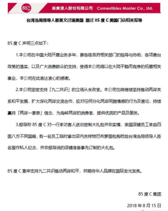 目前,針對(duì)蔡英文“訪問”其美國店面而引起了強(qiáng)烈輿論風(fēng)波,“85度C”剛剛在其開設(shè)在大陸微博和微信平臺(tái)的賬號(hào)上發(fā)布了一則聲明,強(qiáng)調(diào)其支持“九二共識(shí)”和“反對(duì)任何分化兩岸同胞情感的行為及言論”。