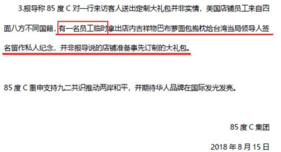 其次,有大陸網(wǎng)友還發(fā)現(xiàn)“85度C”的聲明中有將一切責(zé)任推給“臨時(shí)工”的嫌疑,并回避了導(dǎo)致這場(chǎng)風(fēng)波的“源頭”恰恰是跑到美國為臺(tái)獨(dú)“造勢(shì)”的蔡英文。