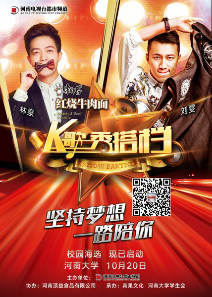 現(xiàn)在,給你機會show出自己!10月20日,由都市頻道和康師傅紅燒牛肉面聯(lián)合推出的《名嘴K歌秀》校園海選活動將在河南大學啟動并進行首場選拔,在接下來的兩個月時間里,該活動將走進省內(nèi)六大高校,尋找最會唱歌的你。最終,本次活動選拔出的優(yōu)秀選手可以和河南廣電全媒體的主持人搭檔演出,參與名嘴演唱會,登上更大更炫的舞臺,實現(xiàn)人生的音樂夢想!
