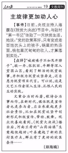 作為十九大的重要獻禮篇,《脫貧大決戰(zhàn)》第二季于10月11日正式播出。從第一季的“認識貧困、了解貧困”,到第二季的“幫扶貧困、解決貧困”,固本求新,展現(xiàn)扶貧工作的現(xiàn)實意義和顯著成效,彰顯河南在全國脫貧攻堅中的責(zé)任和擔(dān)當(dāng)。節(jié)目播出之后,《光明日報》刊發(fā)《“土氣”背后的擔(dān)當(dāng)精神——關(guān)于大型公益扶貧節(jié)目<脫貧大決戰(zhàn)>》?!度嗣袢請蟆钒l(fā)表評論《主旋律更加動人心》,稱贊《脫貧大決戰(zhàn)》是“深入生活、扎根人民的生動實踐”,國務(wù)院扶貧辦、中宣部、省委省政府、省委宣傳部等多個領(lǐng)導(dǎo)對節(jié)目給予充分肯定。