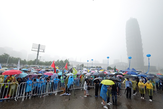 就在活動即將開始的時候,突然下起了瓢潑大雨,工作人員第一時間開始發(fā)放雨衣、雨傘,而市民朋友在穿上雨衣后,有序的站在臺下,等待著活動的開始。