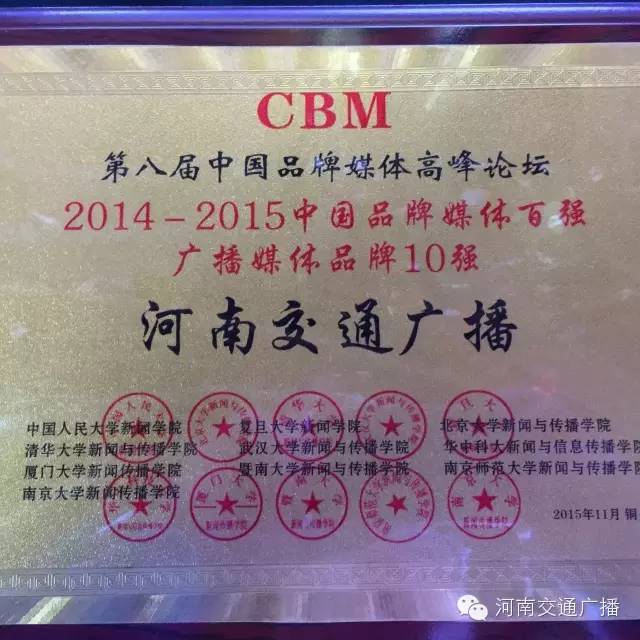 FM1041河南交通廣播榮獲2014-2015中國品牌媒體百強(qiáng)廣播媒體品牌10強(qiáng)。在河南廣播媒體中,僅此一個(gè)。這也是對(duì)河南交通廣播在節(jié)目、活動(dòng)、服務(wù)方面成績的肯定。