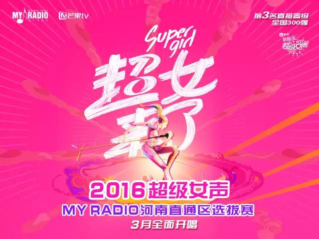 My Radio聯(lián)合芒果TV,2016超級女聲My Radio河南直通區(qū)選拔賽重磅開啟!河南賽區(qū)冠亞季軍,直接晉級全國300強。