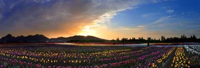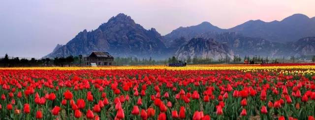四月,天磨湖畔千畝郁金香含苞待放,七彩花海將嵖岈山的奇峰秀水渲染得如詩如畫。
