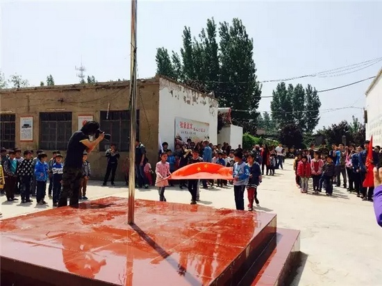 少先隊(duì)員向參加捐贈(zèng)儀式的愛(ài)心代表人士敬獻(xiàn)紅領(lǐng)巾,并獻(xiàn)上孩子們花費(fèi)一下午時(shí)間親自采摘的鮮花,并舉行升國(guó)旗儀式。