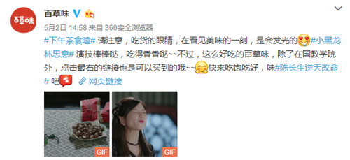 電視劇里收獲滿(mǎn)滿(mǎn)焦點(diǎn),宣傳上,也要給力才行。在廣大觀眾們忙著截圖曬圈時(shí),百草味的官方微博也沒(méi)閑著。電視劇播到哪,小編的截圖就跟到哪。緊跟劇情的同時(shí)附上店鋪鏈接,讓流量順利轉(zhuǎn)化為銷(xiāo)量。