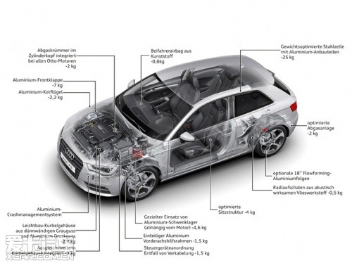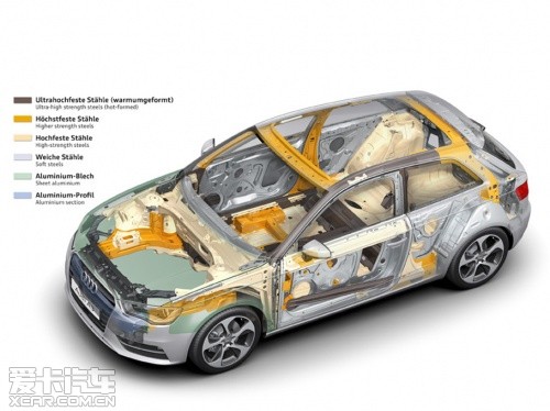 “輕量化”之于奧迪,已然成為品牌精髓所在,截止2011年已有70萬輛裝備了AFS輕質(zhì)車架的奧迪汽車駛下生產(chǎn)線。全新一代奧迪A3相比老款的減重達(dá)到了80千克,首當(dāng)其沖的就是采用了復(fù)合材料車架,車架型材包括了奧迪擁有自主知識(shí)產(chǎn)權(quán)的:超硬鋼、先進(jìn)高強(qiáng)度鋼、高強(qiáng)度鋼、低碳鋼以及鋁板。這些不同材料通過多種連接方式構(gòu)成了強(qiáng)度大幅提升的車身,同時(shí)重量下降了18千克。而大眾集團(tuán)最新的“MQB”橫置發(fā)動(dòng)機(jī)模塊化平臺(tái)則能夠幫助奧迪A3進(jìn)一步減輕重量,比如A3使用的前輪鋁制副車架就帶來了6千克的減重效果。