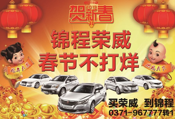 新春佳節(jié)到來之際,小編從河南錦程汽車銷售服務(wù)有限公司了解到,河南錦程榮威春節(jié)不打烊,和您一起過共度佳節(jié)。春節(jié)期間2月9日(除夕)-16日(初七),凡購車客戶均可獲得錦程送出的新春大禮包——年貨。錦程榮威推出了易享貸,更有超實(shí)惠兩年半零利息上汽金融政策,助您開車過年。更多優(yōu)惠車型請咨詢:0371--967777轉(zhuǎn)1.
