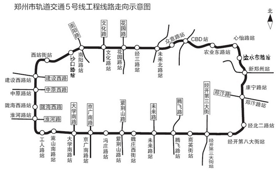 鄭州地鐵5號(hào)線線路沿黃河路、黃河?xùn)|路、商務(wù)外環(huán)路、龍湖外環(huán)路、盛和街、心怡路、經(jīng)開第十大街、航海路、桐柏路和西站路布置,屬于城市核心區(qū)外圍的環(huán)形線路。5號(hào)線全長(zhǎng)約40.4公里,設(shè)車站32座,換乘站15座,平均站間距約1.26公里。全線設(shè)一段一場(chǎng),共設(shè)置兩座主變電所,采用集中供電方式。