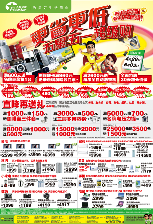 昨天,五星電器五一促銷全面爆發(fā),全省賣場聯(lián)動(dòng)特惠,投入總價(jià)值超過千萬元的特價(jià)產(chǎn)品與促銷資源,涉及到影視、空調(diào)、冰洗、廚衛(wèi)傳統(tǒng)大家電,手機(jī)、數(shù)碼、電腦等消費(fèi)電子類產(chǎn)品。五一活動(dòng)期間,凡消費(fèi)者到五星賣場均可免費(fèi)領(lǐng)取禮品一份,數(shù)量有限,先到先得,更可以4999元把全套家電搬回家。