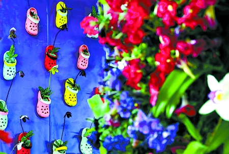 4月6日,“2012洛陽(yáng)·中國(guó)名花展”在洛陽(yáng)國(guó)家牡丹園開展,15天的展期將展出91類、200余種國(guó)內(nèi)珍奇名貴花卉。圖為展出的“仙履芳蹤”插花造型。 新華社發(fā)