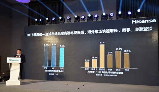 2016年,海信贊助了F1紅牛車隊、澳網(wǎng)公開賽等眾多國際賽事,特別是2016歐洲杯的贊助,助力海信全球知名度和品牌形象大幅提升。受益于全球化品牌運營,海信海外市場高速增長,在歐洲、澳洲、南非、墨西哥等重點市場增幅均在30%以上,在南非和澳洲市場連續(xù)多個月份高居市場第一。