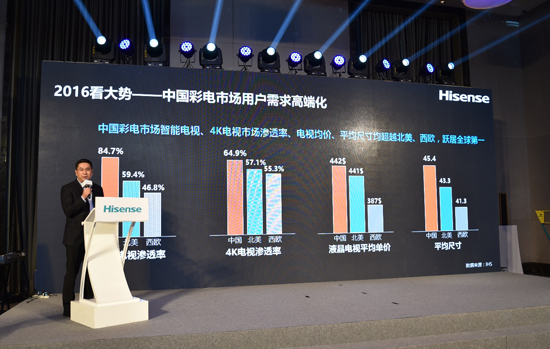 海信發(fā)布的電視產(chǎn)業(yè)年度發(fā)展報告顯示,2016年,中國彩電市場在全球彩出貨量下滑背景逆勢增長,主要受益于中國彩電消費(fèi)市場高端產(chǎn)品需求的增長。從全球來看,中國市場智能電視、4K電視的市場滲透率以及電視均價和平均消費(fèi)尺寸均超越北美、西歐,躍居全球第一。