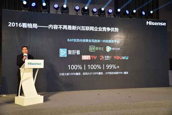 海信電器總經(jīng)理胡劍涌在報告中談到,隨著互聯(lián)網(wǎng)電視的高速普及,新興互聯(lián)網(wǎng)企業(yè)所謂的內(nèi)容競爭優(yōu)勢已不復(fù)存在。以海信互聯(lián)網(wǎng)電視聚好看視頻平臺為例,聚好看資源覆蓋愛奇藝、騰訊視頻、優(yōu)酷等多家視頻媒體資源,可謂是打通BAT,這種優(yōu)勢視頻內(nèi)容整合服務(wù)完勝單一的視頻內(nèi)容平臺服務(wù)。