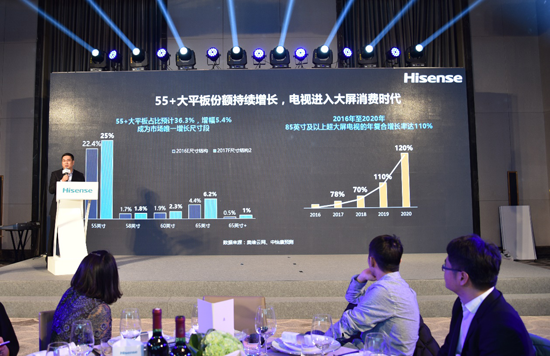 2017年,55+大平板占比預(yù)計將達(dá)到36.3%,市場份額增幅5.4%,成為市場唯一增長尺寸段。未來五年,85英寸以上超大屏市場復(fù)合增長率達(dá)到110%,電視大屏消費(fèi)時代已經(jīng)到來。