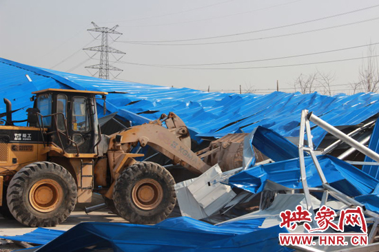 “轟”的一聲,位于滎陽(yáng)市京城辦康砦村龍港路段南側(cè)附近一個(gè)私自搭建的彩鋼瓦棚被鏟車鏟倒,標(biāo)志著京城路街道拆除違法占地、違法建筑活動(dòng)的正式開始。