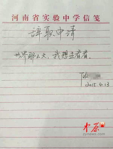 “世界那么大,我想去看看?!苯衲?月,鄭州的中學(xué)女老師顧少強(qiáng)因?yàn)橐环獗毁潪椤笆飞献罹咔閼艳o職信”在網(wǎng)絡(luò)上掀起風(fēng)浪。