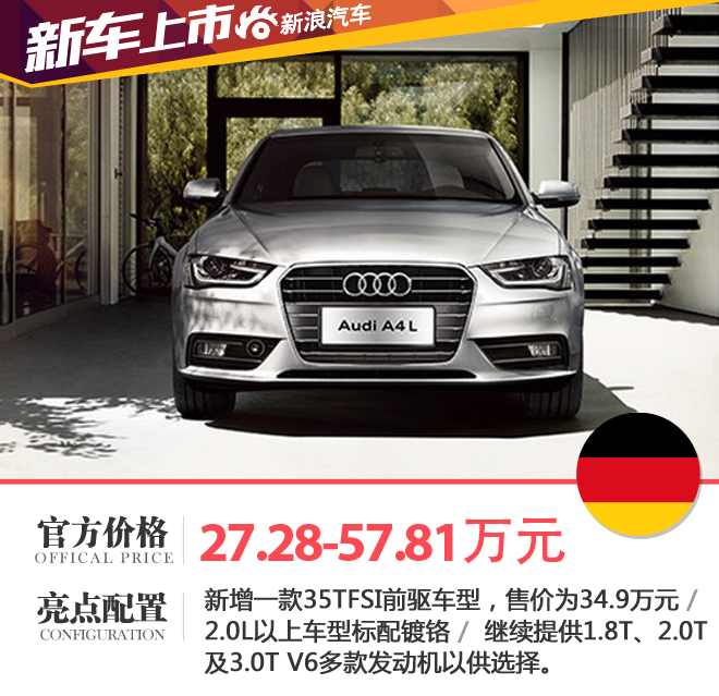 新浪汽車訊 日前,一汽-大眾奧迪官方宣布,旗下2016款A(yù)4L正式上市,新車售價區(qū)間為27.28-57.81萬元。2016款A(yù)4L在原A4L產(chǎn)品序列基礎(chǔ)上新增一款35TFSI前驅(qū)運動型車型,售價為34.9萬元。