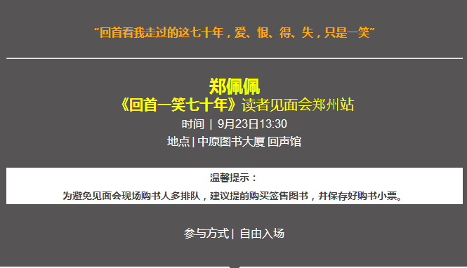 本次活動我們選5位幸運網(wǎng)友,將會有機會獲得前排位置,與鄭佩佩近距離接觸,并贈送中原圖書大廈提供的小禮物。大家可以通過以下方式進行報名。