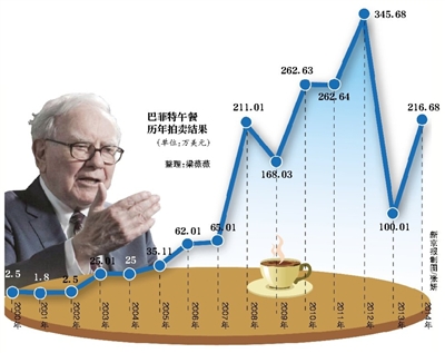 過去的這15次拍賣共籌集了約1780萬美元。最低中標價格為2001年的1.8萬美元,最高為2012年的346萬美元,至今記錄仍未被打破。去年的巴菲特午餐是由新加坡的Andy Chua出價216.68萬美元競得。