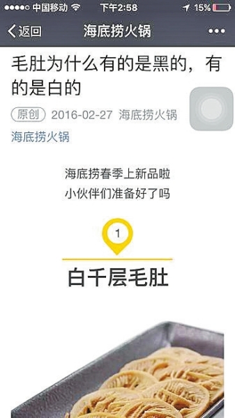 海底撈官方微信對(duì)自家的白毛肚不吝溢美之詞