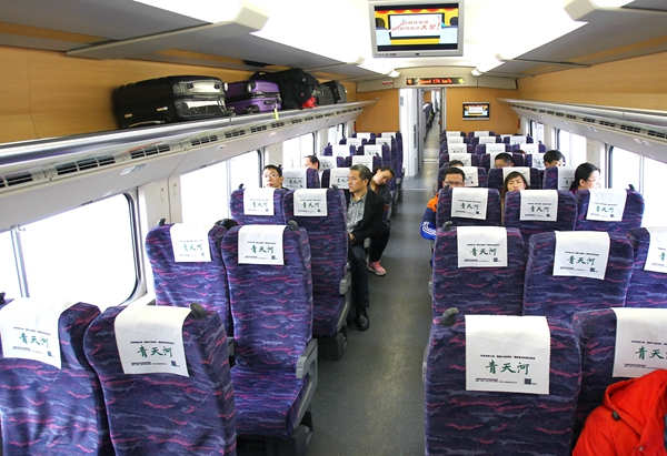 12點(diǎn)02分,記者在鄭州站乘坐C2967次列車再次體驗(yàn),發(fā)現(xiàn)車上的人數(shù)仍舊不多,多節(jié)車廂內(nèi)只有十幾個人,而2號車廂竟然空無一人。17點(diǎn)31分,記者乘坐C2972返程時,車上的人數(shù)則相對較多,多數(shù)車廂有將近30人,最多的一節(jié)有近40人。