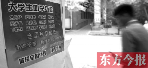 “親愛的同學們,還在為每個月超支的生活費擔心嗎?還在為沒錢買‘愛瘋’著急嗎?還在為沒錢沒法‘說走就走’失落嗎?別發(fā)愁,看這里,無抵押貸款,金額500到5000元,六個月內(nèi)還清,絕無壓力?!?/p>