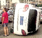 昨日清晨7時(shí)許,在桐柏路航海路南300米帝湖小區(qū)西門(mén),發(fā)生驚險(xiǎn)一幕,一輛保時(shí)捷越野車(chē)從地下車(chē)庫(kù)躥出后,女司機(jī)錯(cuò)把油門(mén)當(dāng)剎車(chē),重傷1人,傷4輛車(chē),因?yàn)檐?chē)速高,保時(shí)捷竟彈起爬上另一輛轎車(chē)上,最終側(cè)翻后停下。