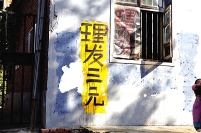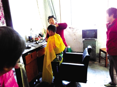 10月30日上午,在省紡機(jī)家屬院門口,老太太的理發(fā)店門外,黃色油漆寫的“理發(fā)三元”的牌子格外醒目,在一間不大的理發(fā)店內(nèi),除去老太太的一張木板床外就是理發(fā)的東西,屋內(nèi)緊挨門口的長(zhǎng)凳上坐滿了前來(lái)理發(fā)的人們,有大人也有小孩,大家坐在那里一邊等著理發(fā),一邊互相閑聊著。老太太正在給一個(gè)十來(lái)歲的小男孩理發(fā),旁邊坐著小男孩的爺爺奶奶。一些附近的農(nóng)民工也不斷進(jìn)來(lái)詢問老太太啥時(shí)候有空給他們理發(fā)。