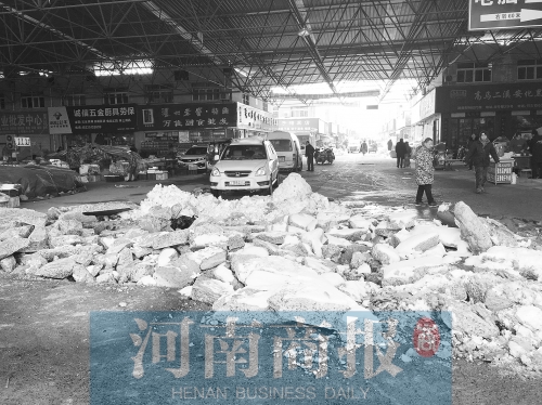 市場內(nèi),在距離大門不遠處的主干道上,約30米長、8米寬的路面被挖得支離破碎,無法通行。因該交易中心與水果市場接壤,水果市場的東門尚可出入,但在兩市場的接壤處,有兩處地面也被挖掘機破壞,步行都很難通過。